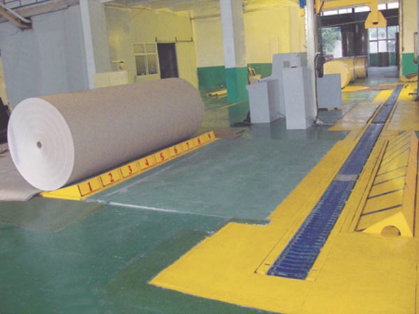 止动装置是将复卷机上下来的纸卷按一定的次序和间隔释放到V型链板输送机,将间断生产变为连续输送。